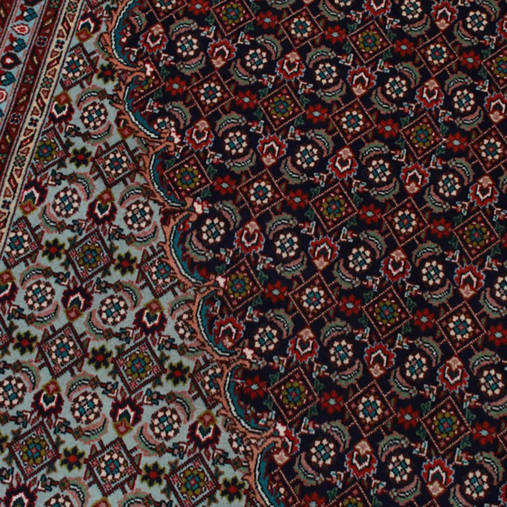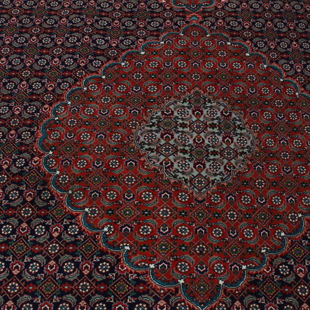 Eine der berühmtesten Arten von Täbriz Teppichen ist der Mahi Musterteppich, der sich durch seinen einzigartigen Stil und sein kompliziertes Muster auszeichnet. Das Mahi Muster (was auf Persisch Fisch bedeutet) wird in mühevoller Kleinarbeit hergestellt und ist eines der traditionellsten persischen Teppichmuster. Im Zentrum des Musters steht in der Regel ein Medaillonmotiv, das von fein gewebten geometrischen und floralen Elementen umgeben ist, die oft in einem kreisförmigen Muster auf dem Teppich angeordnet sind. Die feine Symmetrie und die präzisen Linien von Täbriz Teppichen mit dem Mahi Muster machen sie bei Sammlern und Dekorateuren gleichermaßen äußerst beliebt. Diese Teppiche sind nicht nur ästhetisch beeindruckend, sondern behalten dank ihrer zeitlosen Qualität auch jahrzehntelang ihren Wert. Die einzigartigen Muster und die dichte Knotenanzahl sorgen dafür, dass diese Teppiche sowohl für traditionelle als auch für zeitgenössische Interieurs perfekt geeignet sind. Ein weiteres charakteristisches Merkmal der Mahi Teppiche ist ihre subtile Farbpalette, die oft aus natürlichen Erdtönen und tiefen Schattierungen wie Beige, Braun, Blau und Rot besteht. Diese Farben strahlen Harmonie aus und tragen dazu bei, die komplexen Muster zu betonen, die jeden Täbriz Teppich einzigartig und unwiederholbar machen.