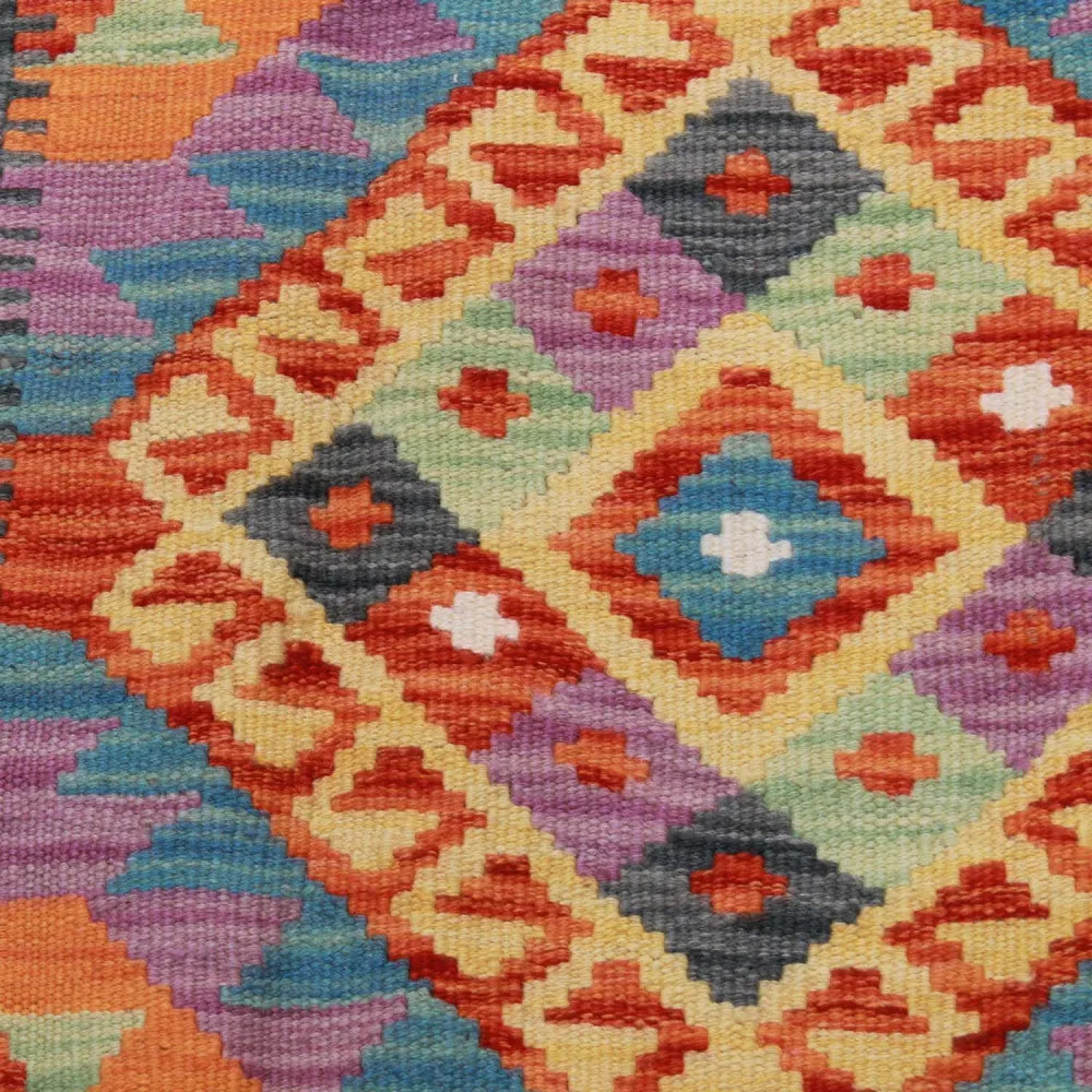 Handgewebte afghanische Kelims, Meisterwerke afghanischer Handwerkskunst, sind in der ganzen Welt hoch geschätzt und beliebt. Diese besonderen handgewebten Kelim Teppiche sind in der Regel dichter und kompakter als andere Kelim Arten, was auf eine spezielle Webtechnik zurückzuführen ist. Dank dieser Technik haben afghanische handgewebte Kelims eine feinere Textur und sind schneller fertig als handgeknüpfte Teppiche. Die Designs der Chobi Kelim Teppiche verbinden antike und moderne Elemente, so dass jeder ein Stück finden kann, das zu seinem Stil passt. Diese handgewebten Teppiche sind bei Innenarchitekten besonders beliebt, da sie sich harmonisch in die Farben der meisten Wohnungen einfügen und aufgrund ihrer erschwinglichen Preisklasse weit verbreitet sind. Chobi Kelim Teppiche können auf vielfältige Weise zur Dekoration eines Hauses verwendet werden, sei es als Wandteppich oder als Läufer. Diese ethnischen Teppiche haben einen hohen künstlerischen und kulturellen Wert. Afghanische handgewebte Kelims sind nicht nur ästhetisch ansprechend, sondern auch von großer historischer und kultureller Bedeutung. Handgewebte Teppiche bewahren die reiche Tradition und das Erbe des afghanischen Kunsthandwerks, wobei jeder Teppich einzigartig und unverwechselbar ist. Kelims aus Wolle tragen mit ihrer natürlichen Materialverwendung dazu bei, eine behagliche und einladende Atmosphäre zu schaffen.