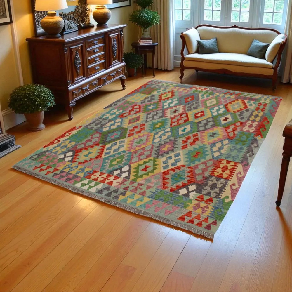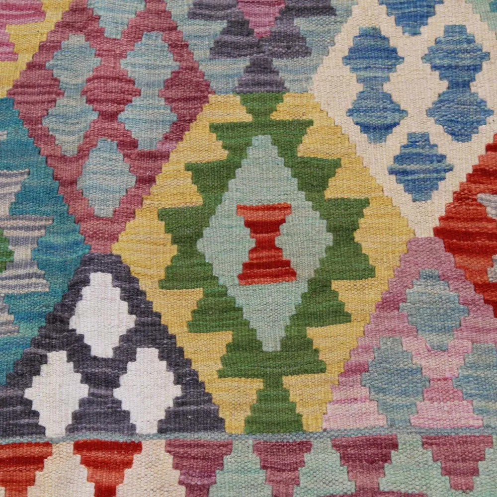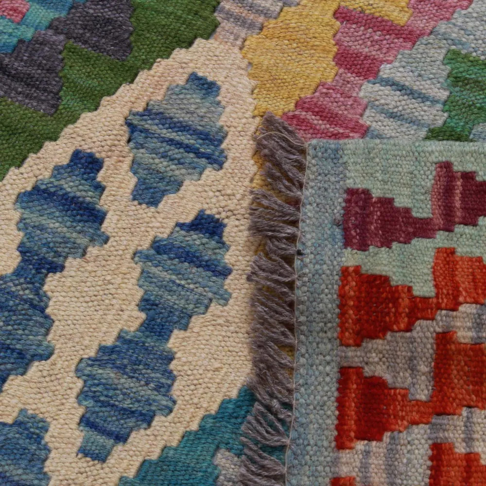Der handgewebte Kelim Teppich ist in der ganzen Welt bekannt und beliebt. Das Besondere am Chobi Kelim Teppich ist, dass er aufgrund seiner speziellen Webtechnik dichter und kompakter ist als andere Kelims. Diese Technik macht afghanische Kelim Teppiche dünner und schneller herzustellen als traditionell geknüpfte Teppiche. Das Muster des Chobi Kelim Teppichs ist im antiken Stil gehalten, aber auch wer moderne Designs bevorzugt, wird hier fündig. Vintage Kelim Teppiche sind besonders beliebt, weil sie sich perfekt in die meisten Farbschemata für Wohnzimmer einfügen und zu den preisgünstigen Teppichen gehören. Chobi Kelim Teppiche können auf viele verschiedene Arten zur Dekoration Ihres Zuhauses verwendet werden. Sie können als Wandteppiche oder auf traditionelle Weise auf dem Boden ausgelegt werden. Diese ethnischen Kelim Teppiche sind eine ideale Wahl für das Wohnzimmer, wo sie als Blickfang im Raum dienen können. Afghanische Kelim Teppiche haben einen besonderen künstlerischen Wert, der nicht nur in ihrem ästhetischen Wert, sondern auch in ihrer historischen und kulturellen Bedeutung zum Ausdruck kommt. Handgefertigte Kelim Teppiche tragen das Erbe afghanischer Handwerkskunst und Traditionen in sich und machen jeden Kelim einzigartig und unwiederholbar. Die Wollteppiche werden aus natürlichen Materialien hergestellt, die zur warmen und einladenden Atmosphäre des Wohnzimmers beitragen.