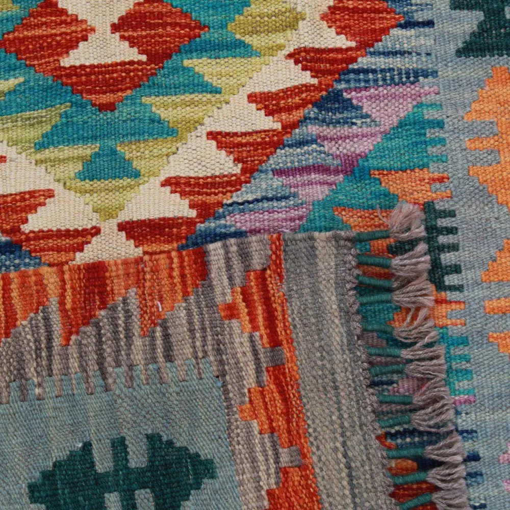 Handgewebte afghanische Kelims, Meisterwerke afghanischer Handwerkskunst, sind in der ganzen Welt hoch geschätzt und beliebt. Diese besonderen handgewebten Kelim Teppiche sind in der Regel dichter und kompakter als andere Kelim Arten, was auf eine spezielle Webtechnik zurückzuführen ist. Dank dieser Technik haben afghanische handgewebte Kelims eine feinere Textur und sind schneller fertig als handgeknüpfte Teppiche. Die Designs der Chobi Kelim Teppiche verbinden antike und moderne Elemente, so dass jeder ein Stück finden kann, das zu seinem Stil passt. Diese handgewebten Teppiche sind bei Innenarchitekten besonders beliebt, da sie sich harmonisch in die Farben der meisten Wohnungen einfügen und aufgrund ihrer erschwinglichen Preisklasse weit verbreitet sind. Chobi Kelim Teppiche können auf vielfältige Weise zur Dekoration eines Hauses verwendet werden, sei es als Wandteppich oder als Läufer. Diese ethnischen Teppiche haben einen hohen künstlerischen und kulturellen Wert. Afghanische handgewebte Kelims sind nicht nur ästhetisch ansprechend, sondern auch von großer historischer und kultureller Bedeutung. Handgewebte Teppiche bewahren die reiche Tradition und das Erbe des afghanischen Kunsthandwerks, wobei jeder Teppich einzigartig und unverwechselbar ist. Kelims aus Wolle tragen mit ihrer natürlichen Materialverwendung dazu bei, eine behagliche und einladende Atmosphäre zu schaffen.