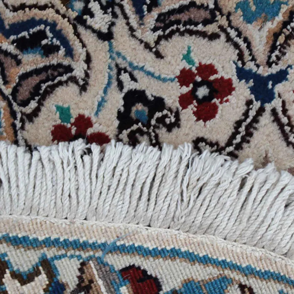 Die Stadt Nain liegt im Zentraliran, in der Nähe der berühmten Stadt Isfahan, und ist seit Jahrhunderten für ihre handwerklichen Traditionen bekannt. Obwohl die Geschichte der Teppichherstellung in Nain relativ jung ist, haben die Bewohner der Stadt das Handwerk schnell etabliert und ihre Techniken verfeinert. Die ursprüngliche Webtradition konzentrierte sich mehr auf die Herstellung von feinen Tüchern und Textilien, doch Mitte des 20. Jahrhunderts übernahm die Teppichweberei schnell die Hauptrolle. Die Teppiche der Stadt Nain wurden zu Symbolen für Qualität, Eleganz und raffinierte Muster. Einheimische Handwerker verwenden hochwertige Wolle oder Seide, um extrem komplizierte Teppiche herzustellen. Im Gegensatz zu Teppichen aus anderen Regionen des Landes sind die Teppiche aus Nain typischerweise in helleren Farbtönen gehalten, oft in Creme-, Beige- und hellblauen Tönen. Die Teppichweberei ist zu einer tragenden Säule der Wirtschaft der Stadt geworden, und die Nain Teppiche sind zu Symbolen der persischen Teppichweberei in der modernen Welt geworden.
