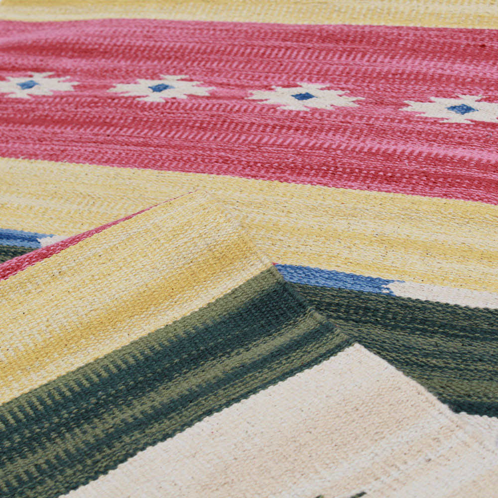 Der indische Kelim Teppich ist ein besonderer Dekorationsartikel, der direkt aus Indien zu uns kommt. Der moderne Kelim teppich ist extrem leicht und eignet sich daher hervorragend als Wandteppich, da er weniger als 1 kg pro Quadratmeter wiegt. Er wird mit speziellen Herstellungsverfahren gefertigt, was bedeutet, dass indische Kelim Teppiche dünner und schneller verfügbar sind als ihre herkömmlichen Pendants. In Indien arbeiten Großmanufakturen an der Massenproduktion dieser Kelim Teppiche und kombinieren dabei Hand- und Maschinenweberei. Das Design der indischen Kelim Teppiche ist modern und umfasst eine Vielzahl von leuchtenden Farben. Aufgrund ihrer großen Beliebtheit sind sie in vielen Wohnungen zu finden, sei es an den Wänden oder auf dem Boden. Als Läufer sind sie auch eine ausgezeichnete Wahl für Flure. Ob im Wohnzimmer oder im Flur, sie schaffen in jedem Raum eine besondere Atmosphäre. Indische Kelims aus Baumwolle sind farbenprächtig und die Intensität der Farben verblasst nicht beim Waschen. Ihr erschwinglicher Preis macht sie in vielen Haushalten zu einem Vergnügen. Der Teppich kann auch über einer Fußbodenheizung verlegt werden, da er wärmeübertragende Eigenschaften hat.