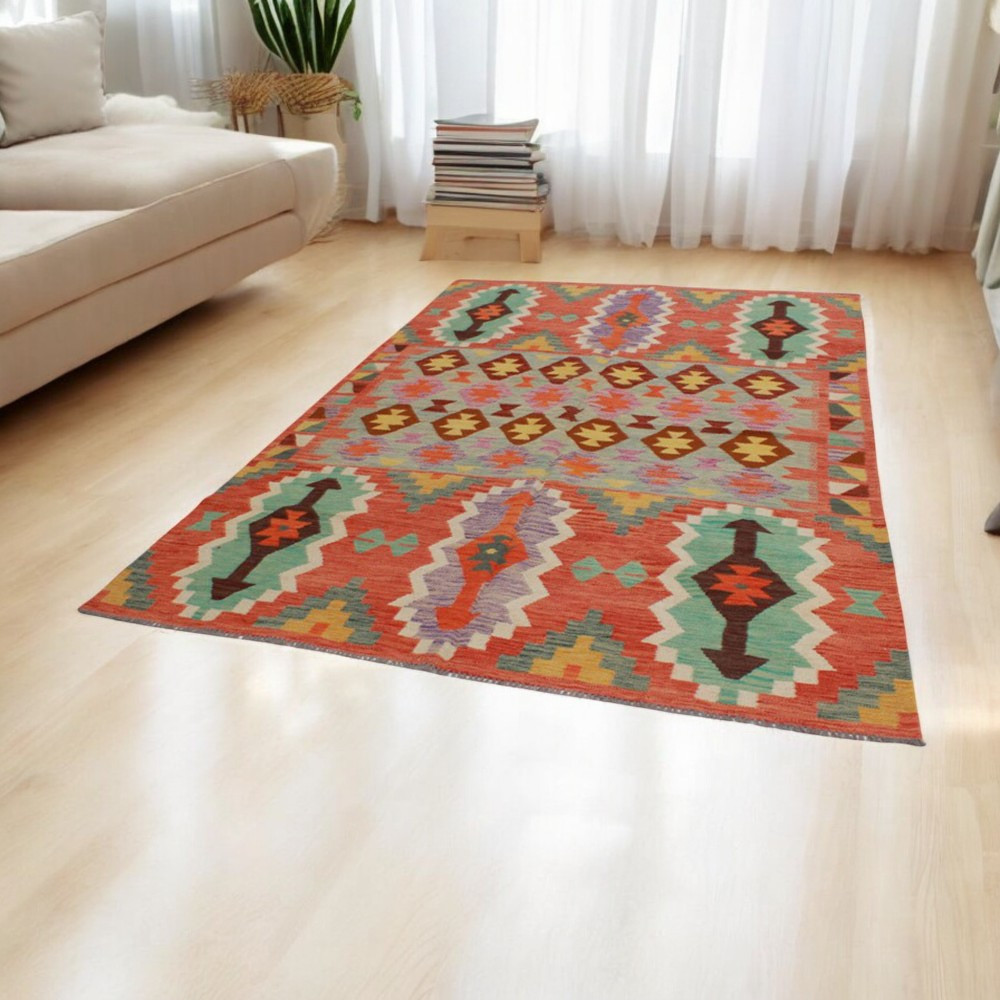 Der handgewebte Kelim Teppich ist in der ganzen Welt bekannt und beliebt. Das Besondere am Chobi Kelim Teppich ist, dass er aufgrund seiner speziellen Webtechnik dichter und kompakter ist als andere Kelims. Diese Technik macht afghanische Kelim Teppiche dünner und schneller herzustellen als traditionell geknüpfte Teppiche. Das Muster des Chobi Kelim Teppichs ist im antiken Stil gehalten, aber auch wer moderne Designs bevorzugt, wird hier fündig. Vintage Kelim Teppiche sind besonders beliebt, weil sie sich perfekt in die meisten Farbschemata für Wohnzimmer einfügen und zu den preisgünstigen Teppichen gehören. Chobi Kelim Teppiche können auf viele verschiedene Arten zur Dekoration Ihres Zuhauses verwendet werden. Sie können als Wandteppiche oder auf traditionelle Weise auf dem Boden ausgelegt werden. Diese ethnischen Kelim Teppiche sind eine ideale Wahl für das Wohnzimmer, wo sie als Blickfang im Raum dienen können. Afghanische Kelim Teppiche haben einen besonderen künstlerischen Wert, der nicht nur in ihrem ästhetischen Wert, sondern auch in ihrer historischen und kulturellen Bedeutung zum Ausdruck kommt. Handgefertigte Kelim Teppiche tragen das Erbe afghanischer Handwerkskunst und Traditionen in sich und machen jeden Kelim einzigartig und unwiederholbar. Die Wollteppiche werden aus natürlichen Materialien hergestellt, die zur warmen und einladenden Atmosphäre des Wohnzimmers beitragen.