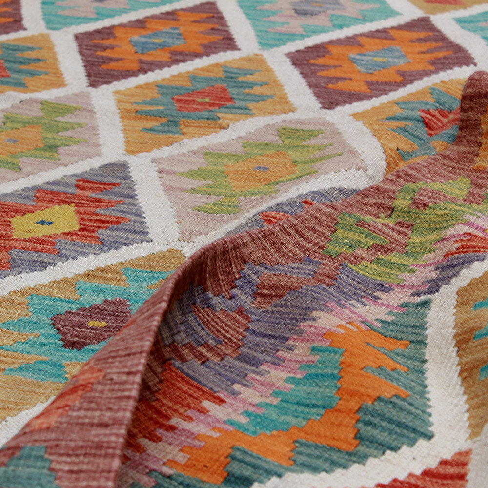 Der handgewebte Kelim Teppich ist in der ganzen Welt bekannt und beliebt. Das Besondere am Chobi Kelim Teppich ist, dass er aufgrund seiner speziellen Webtechnik dichter und kompakter ist als andere Kelims. Diese Technik macht afghanische Kelim Teppiche dünner und schneller herzustellen als traditionell geknüpfte Teppiche. Das Muster des Chobi Kelim Teppichs ist im antiken Stil gehalten, aber auch wer moderne Designs bevorzugt, wird hier fündig. Vintage Kelim Teppiche sind besonders beliebt, weil sie sich perfekt in die meisten Farbschemata für Wohnzimmer einfügen und zu den preisgünstigen Teppichen gehören. Chobi Kelim Teppiche können auf viele verschiedene Arten zur Dekoration Ihres Zuhauses verwendet werden. Sie können als Wandteppiche oder auf traditionelle Weise auf dem Boden ausgelegt werden. Diese ethnischen Kelim Teppiche sind eine ideale Wahl für das Wohnzimmer, wo sie als Blickfang im Raum dienen können. Afghanische Kelim Teppiche haben einen besonderen künstlerischen Wert, der nicht nur in ihrem ästhetischen Wert, sondern auch in ihrer historischen und kulturellen Bedeutung zum Ausdruck kommt. Handgefertigte Kelim Teppiche tragen das Erbe afghanischer Handwerkskunst und Traditionen in sich und machen jeden Kelim einzigartig und unwiederholbar. Die Wollteppiche werden aus natürlichen Materialien hergestellt, die zur warmen und einladenden Atmosphäre des Wohnzimmers beitragen.
