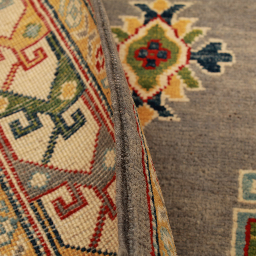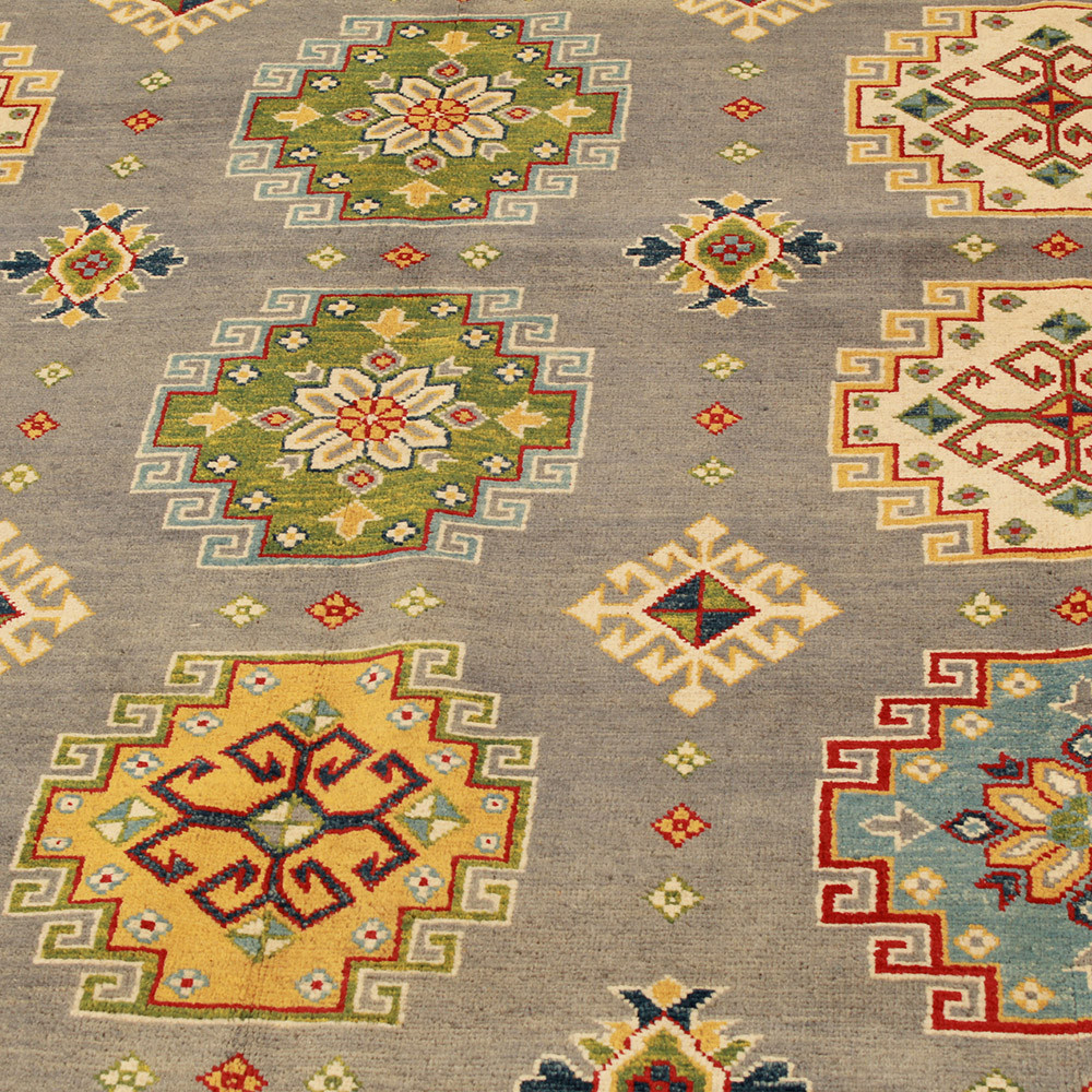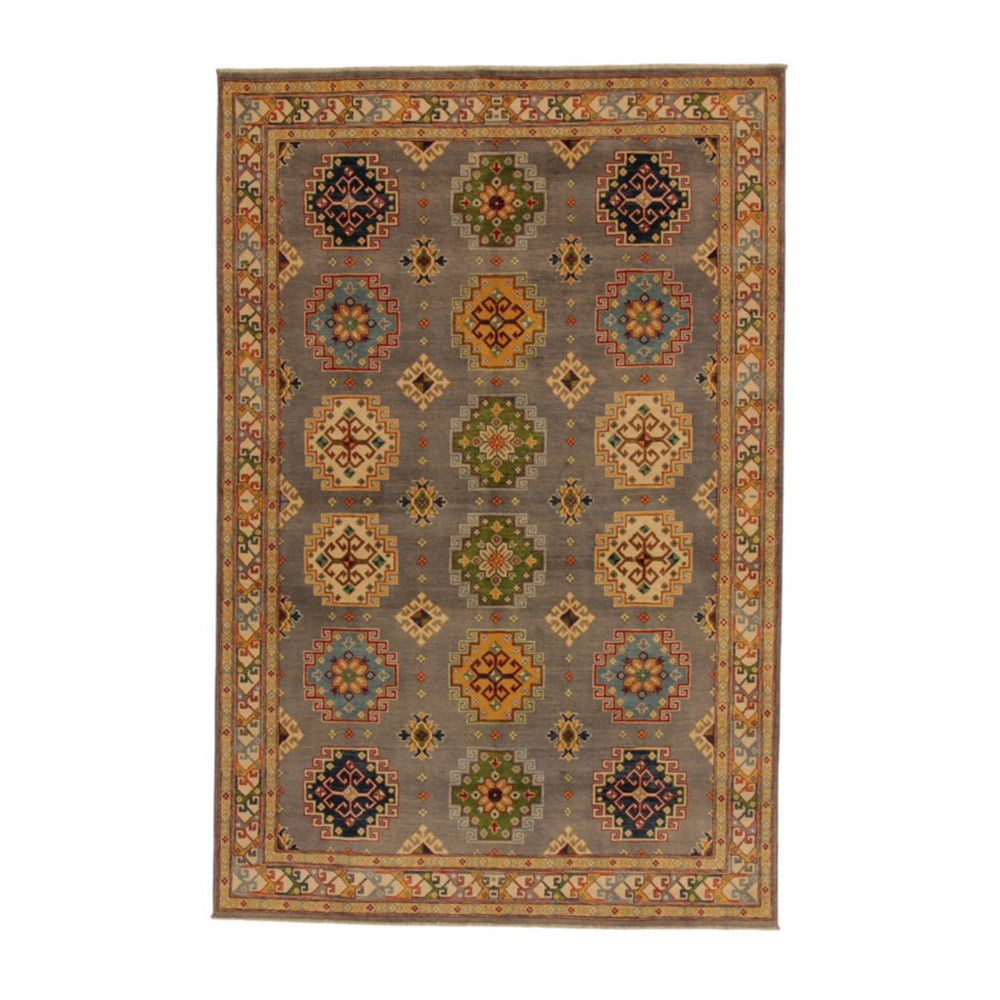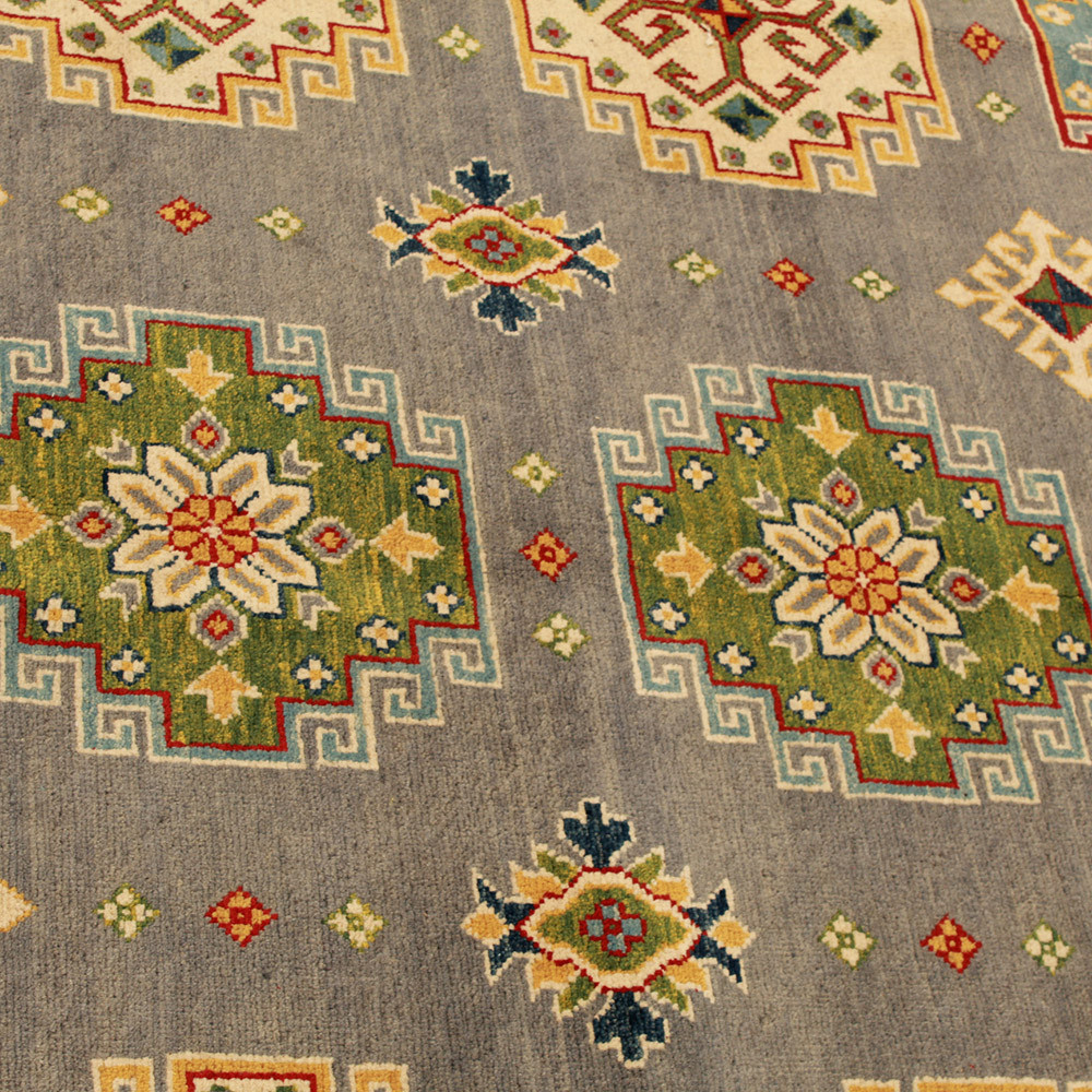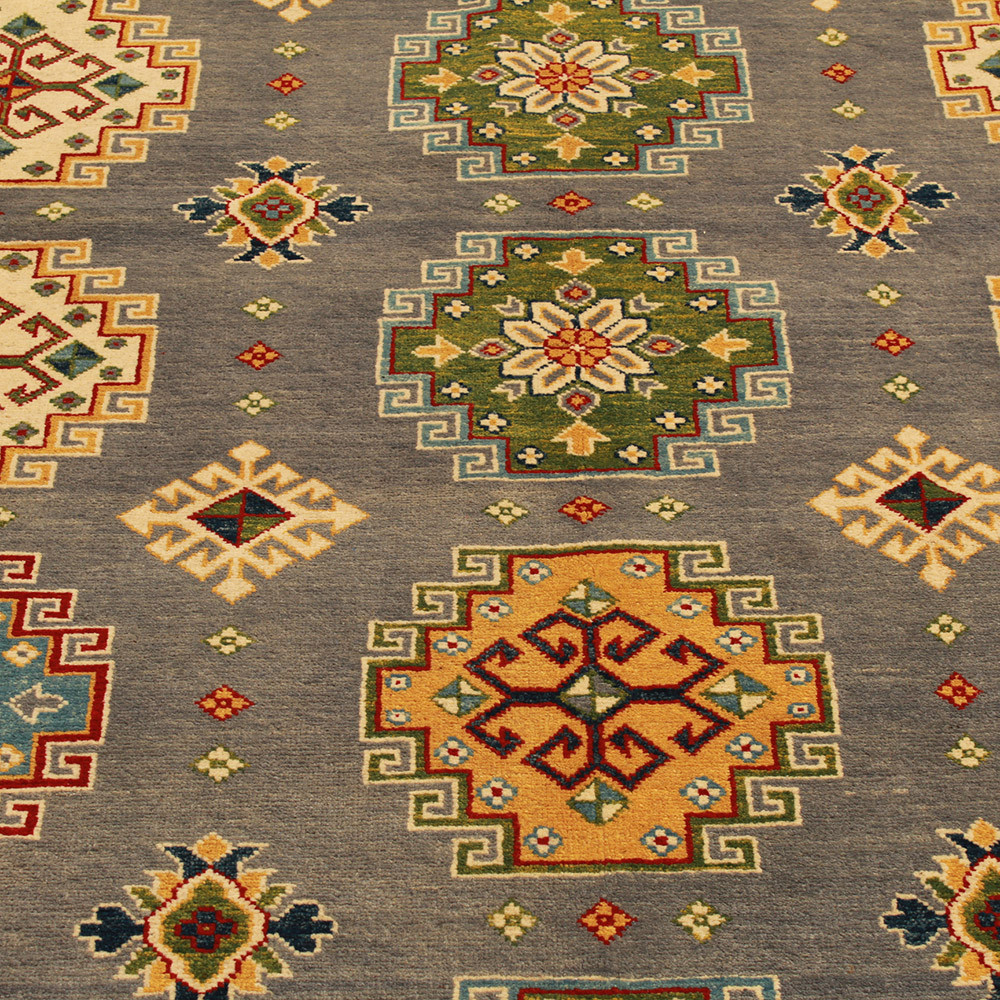 Suchen Sie nach einem farbenfrohen Orientteppich? Dann werfen Sie einen Blick auf diesen Kazak Teppich, der Sie mit seinen schönen verspielten Farben bezaubern wird. Dieser Kazak Teppich ist strapazierfähig, pflegeleicht und staubsaugergeeignet. Er eignet sich am besten für Räume mit klassischem Interieur. Da es sich um einen mehrfarbigen Orientteppich handelt, lässt er sich leicht mit den Farben von Möbeln oder anderen Textilien abstimmen. Dieser Kazak Teppich wird viermal gewaschen und in der Sonne getrocknet. Er enthält keine allergieauslösenden Stoffe. Er kann auch in Räumen mit Fußbodenheizung verwendet werden, aber in diesem Fall ist es ratsam, unter dem Teppich zu saugen, um Motten zu vermeiden. Die Farben des Kazak Teppichs sind von Pflanzen aus der Natur abgeleitet. Kazak Teppiche werden hauptsächlich in Afghanistan oder in den von Afghanen bevölkerten Teilen Pakistans hergestellt. Da es sich um einen strapazierfähigen Teppich handelt, kann er selbst in den belebtesten Wohnzimmern verwendet werden. Er verleiht Ihrem Wohnzimmer Eleganz und Prestige. Der Kazak Teppich wird aus 100% afghanischer Wolle hergestellt. Er zeichnet sich hauptsächlich durch geometrische Muster aus. Dies ist ein wirklich hochwertiger, handgeknüpfter Teppich.