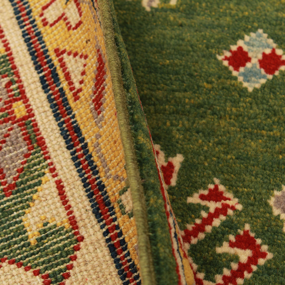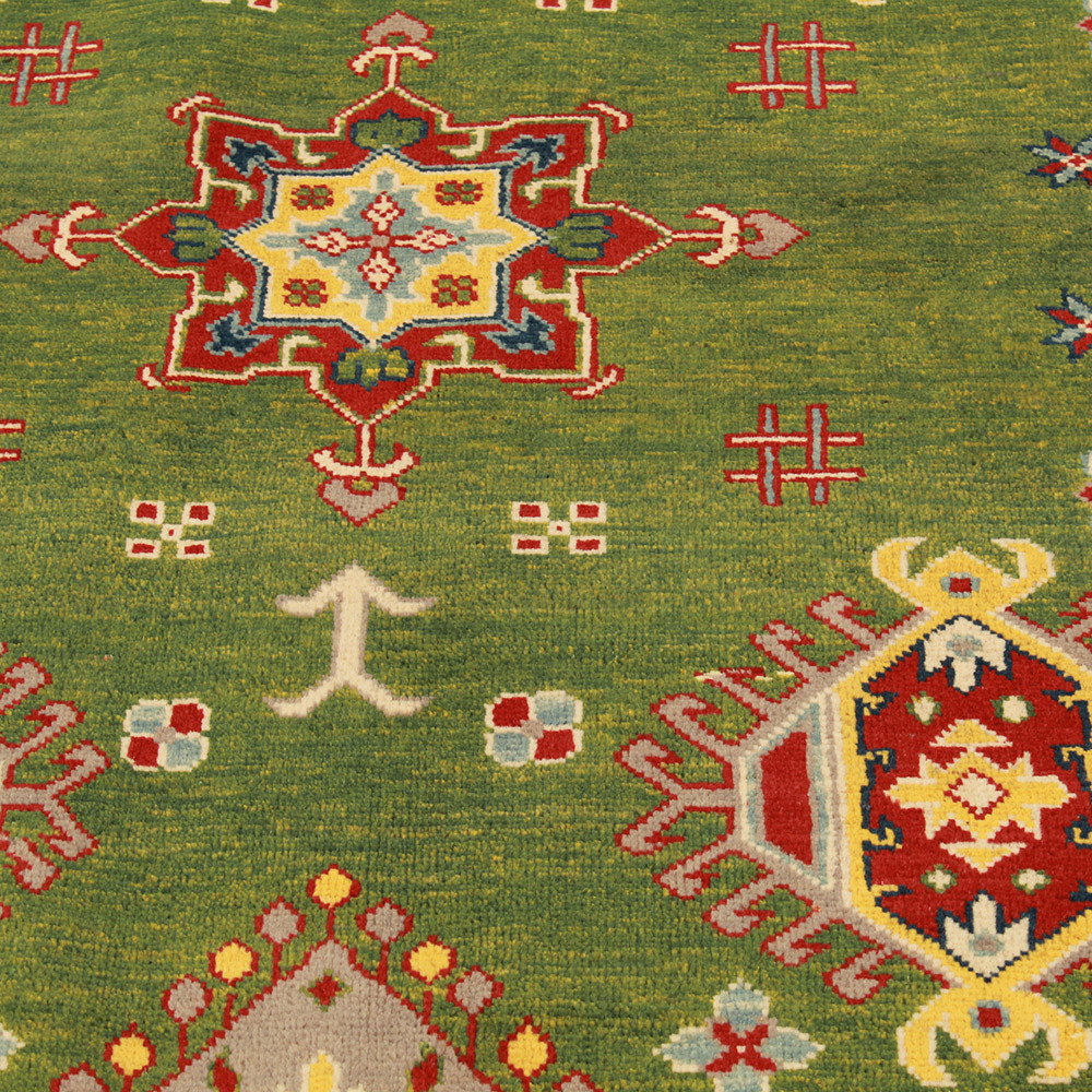 Suchen Sie nach einem farbenfrohen Orientteppich? Dann werfen Sie einen Blick auf diesen Kazak Teppich, der Sie mit seinen schönen verspielten Farben bezaubern wird. Dieser Kazak Teppich ist strapazierfähig, pflegeleicht und staubsaugergeeignet. Er eignet sich am besten für Räume mit klassischem Interieur. Da es sich um einen mehrfarbigen Orientteppich handelt, lässt er sich leicht mit den Farben von Möbeln oder anderen Textilien abstimmen. Dieser Kazak Teppich wird viermal gewaschen und in der Sonne getrocknet. Er enthält keine allergieauslösenden Stoffe. Er kann auch in Räumen mit Fußbodenheizung verwendet werden, aber in diesem Fall ist es ratsam, unter dem Teppich zu saugen, um Motten zu vermeiden. Die Farben des Kazak Teppichs sind von Pflanzen aus der Natur abgeleitet. Kazak Teppiche werden hauptsächlich in Afghanistan oder in den von Afghanen bevölkerten Teilen Pakistans hergestellt. Da es sich um einen strapazierfähigen Teppich handelt, kann er selbst in den belebtesten Wohnzimmern verwendet werden. Er verleiht Ihrem Wohnzimmer Eleganz und Prestige. Der Kazak Teppich wird aus 100% afghanischer Wolle hergestellt. Er zeichnet sich hauptsächlich durch geometrische Muster aus. Dies ist ein wirklich hochwertiger, handgeknüpfter Teppich.