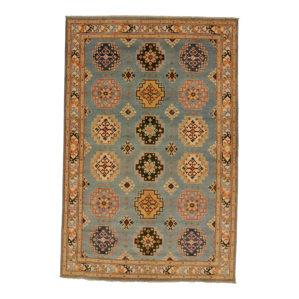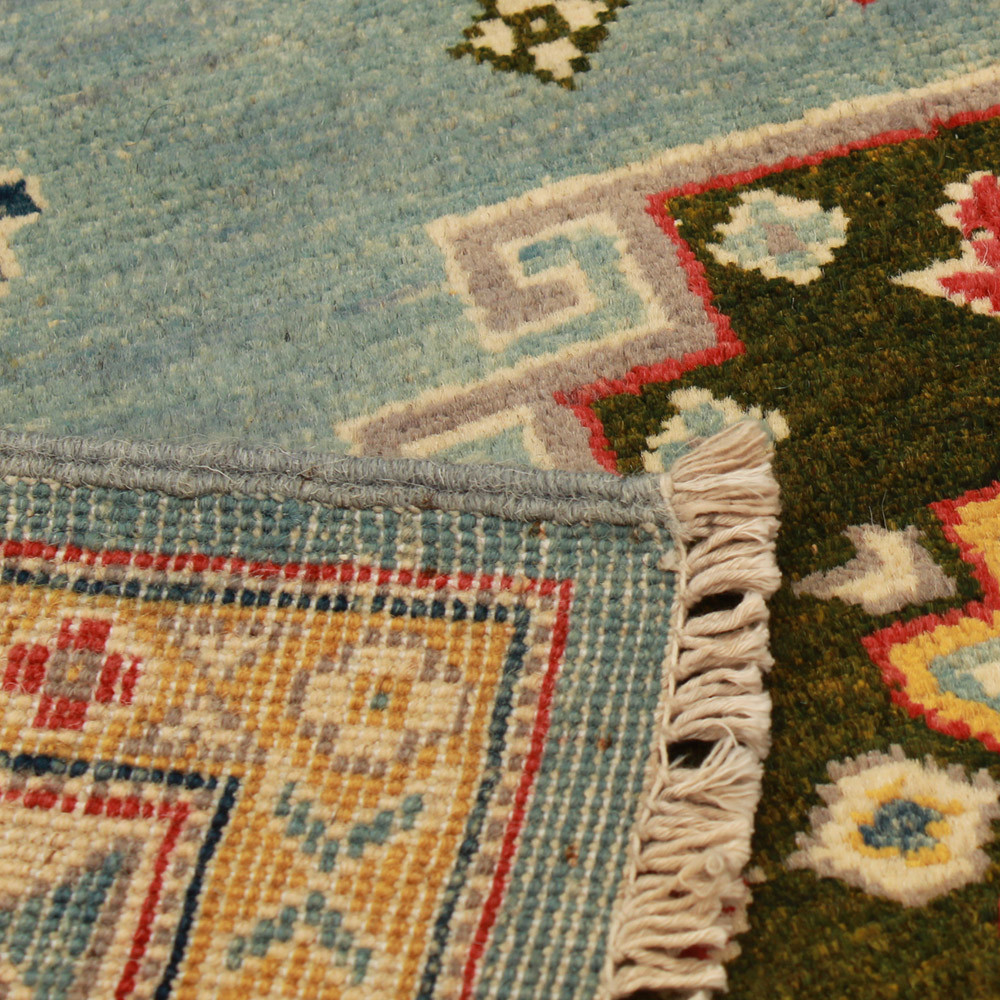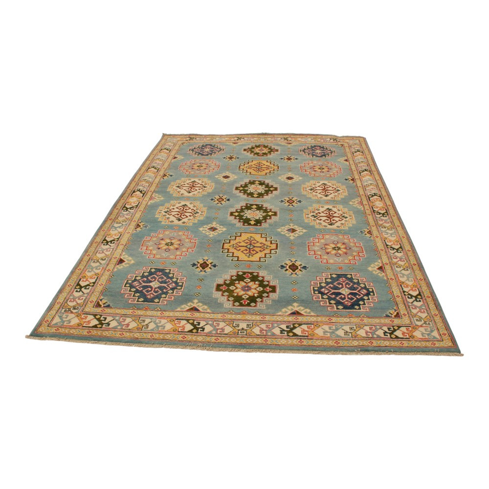 Kazak Teppiche sind vor allem wegen ihrer warmen und doch hellen Farben beliebt geworden. Er wird am häufigsten von Innenarchitekten für klassisch eingerichtete Wohnungen empfohlen. Seine Designs sind von russischen geometrischen Mustern inspiriert. Er wird nur Kazak Teppich genannt, aber es ist ein afghanischer Teppich. Die verwendete Wolle wird mit natürlichen Pflanzenfarbstoffen gefärbt. Der Kazak Orientteppich zeichnet sich durch eine kräftige Farbgebung aus. Sein Vorteil ist, dass er dank seiner hellen Farben die Atmosphäre Ihres Zimmers nicht verdunkelt. Als Wohnzimmer Teppich passt er perfekt zu den Farben von Sofas oder Couchtischen. Als Teppich im Schlafzimmer wird er auch an den beiden Seiten des Bettes verwendet. In diesem Fall ist es ausreichend, wenn die Farben der Teppiche aufeinander abgestimmt sind. Jeder Schritt der Teppichherstellung ist 100% handgeknüpft. Dank seiner Strapazierfähigkeit kann er auch in den belebtesten Wohnzimmern verlegt werden. Die Knüpftechnik der Kazak Teppiche wird Gheordes genannt, was soviel bedeutet wie "doppelt geknüpft". Sobald der Teppich fertig ist, wird er viermal gewaschen und anschließend in der Sonne getrocknet. Er enthält keine allergieauslösenden Stoffe.
