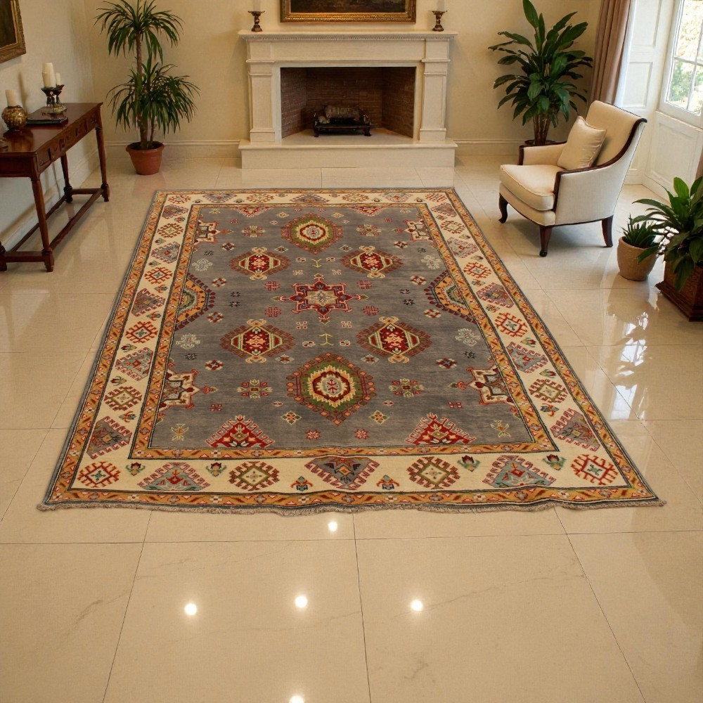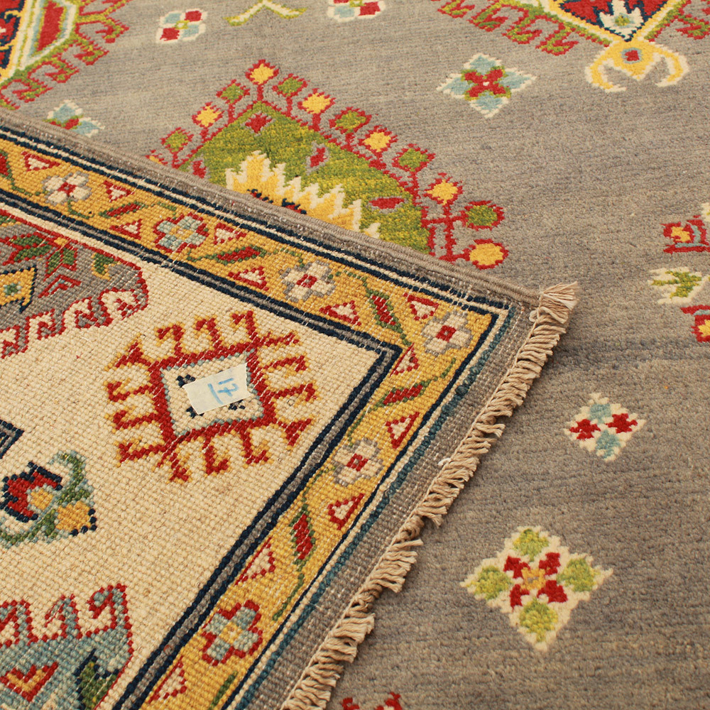 Suchen Sie nach einem farbenfrohen Orientteppich? Dann werfen Sie einen Blick auf diesen Kazak Teppich, der Sie mit seinen schönen verspielten Farben bezaubern wird. Dieser Kazak Teppich ist strapazierfähig, pflegeleicht und staubsaugergeeignet. Er eignet sich am besten für Räume mit klassischem Interieur. Da es sich um einen mehrfarbigen Orientteppich handelt, lässt er sich leicht mit den Farben von Möbeln oder anderen Textilien abstimmen. Dieser Kazak Teppich wird viermal gewaschen und in der Sonne getrocknet. Er enthält keine allergieauslösenden Stoffe. Er kann auch in Räumen mit Fußbodenheizung verwendet werden, aber in diesem Fall ist es ratsam, unter dem Teppich zu saugen, um Motten zu vermeiden. Die Farben des Kazak Teppichs sind von Pflanzen aus der Natur abgeleitet. Kazak Teppiche werden hauptsächlich in Afghanistan oder in den von Afghanen bevölkerten Teilen Pakistans hergestellt. Da es sich um einen strapazierfähigen Teppich handelt, kann er selbst in den belebtesten Wohnzimmern verwendet werden. Er verleiht Ihrem Wohnzimmer Eleganz und Prestige. Der Kazak Teppich wird aus 100% afghanischer Wolle hergestellt. Er zeichnet sich hauptsächlich durch geometrische Muster aus. Dies ist ein wirklich hochwertiger, handgeknüpfter Teppich.