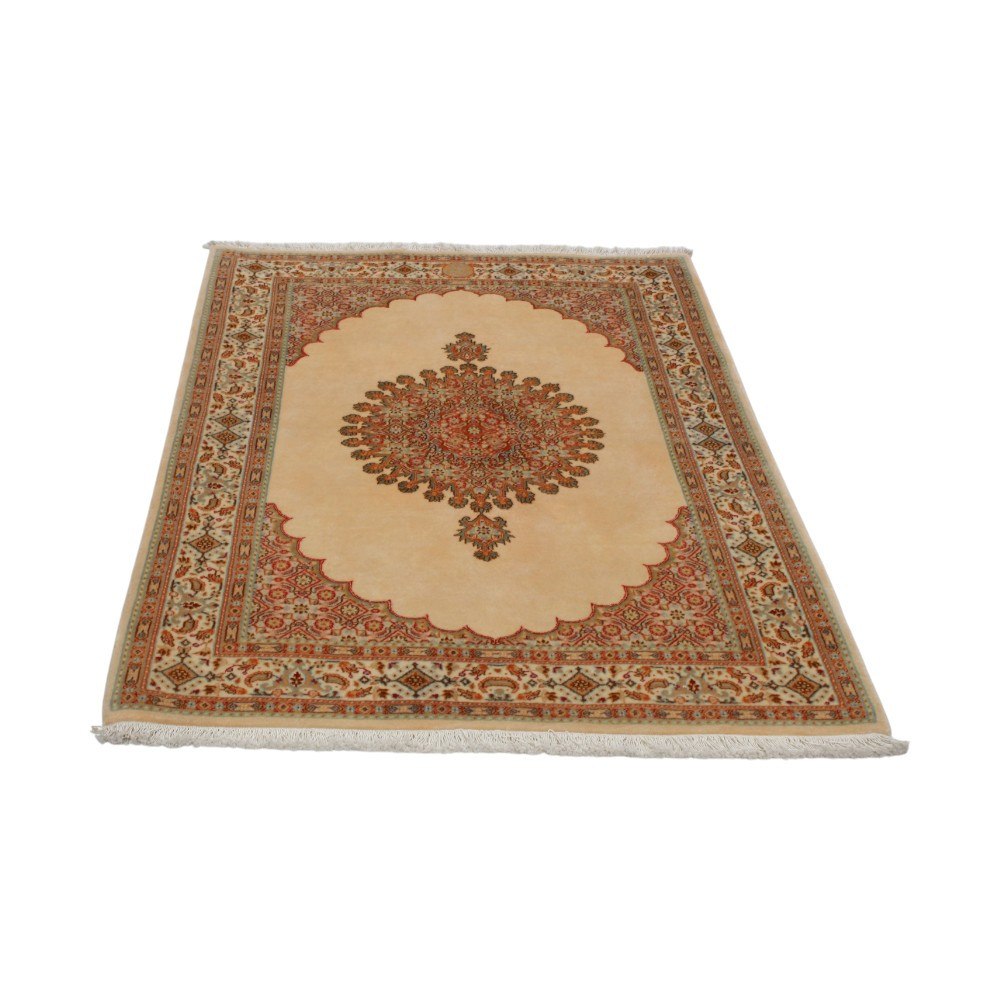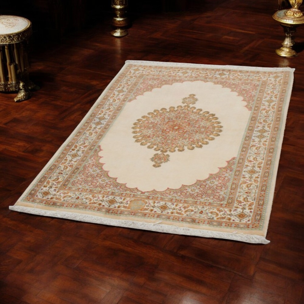 Die Moud-Teppiche sind bekannt für ihre feine Knüpftechnik, die es ermöglicht, komplexe Muster und Details zu schaffen. Mit 250.000 bis 450.000 Knoten pro Quadratmeter bieten diese Teppiche eine außergewöhnliche Haltbarkeit und Schönheit. Die Verwendung von hochwertiger Wolle, gefärbt mit natürlichen Farbstoffen, verleiht dem Teppich seine lebendige Farbpalette aus Blau-, Rot- und Beigetönen. Diese natürlichen Farben strahlen Harmonie und Eleganz aus und machen den Teppich zu einem zeitlosen Kunstwerk. Moud-Teppiche sind nicht nur visuell ansprechend, sondern tragen auch eine reiche kulturelle Bedeutung. Die floralen und geometrischen Muster, wie das berühmte „Herati“-Motiv und der „Medallion“-Stil, verleihen jedem Moud-Teppich einen einzigartigen Charakter.