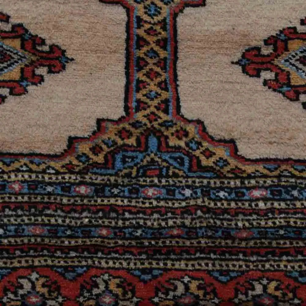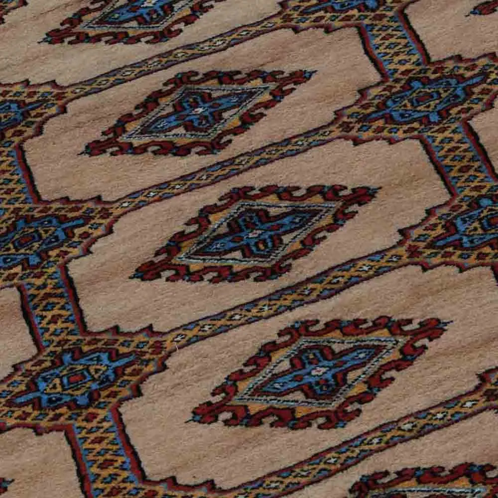 Der pakistanische Teppich wird in den Provinzen Punjab und Sindh geknüpft. Dieser Orientteppich, der eine jahrhundertealte Tradition widerspiegelt, ist eine Hommage an die Handwerkskunst und die Kunstfertigkeit der Kunsthandwerker. Pakistanische Teppiche sind weltweit für ihre Qualität bekannt und tragen das reiche kulturelle Erbe Pakistans in sich. Das Design und die Herstellungstechniken dieser Orientteppiche stammen von den Turkmenen, die sie auf dem alten Teppichmarkt der berühmten Stadt Buchara gehandelt haben. Eines der berühmtesten Muster (Bukhara) hat seinen Namen von hier und ist seitdem ein charakteristisches Merkmal dieser schönen Orientteppiche. Die pakistanischen Teppiche werden aus neuseeländischer Merinowolle hergestellt, die für hervorragende Qualität und Haltbarkeit sorgt. Dank ihrer dichten Knüpfung sind sie langlebig und widerstandsfähig gegen die Abnutzung durch den täglichen Gebrauch. Dieser elegante Teppich gilt heute als einer der besten Wollteppiche in Pakistan. Nach der Herstellung und dem Scheren wird der Teppich viermal gewaschen und anschließend sorgfältig getrocknet, um seine leuchtenden Farben und seine Farbechtheit zu bewahren. Mit ihren geometrischen Mustern und eleganten Farben verleihen sie Ihrem Zuhause ein einzigartiges Ambiente, ganz gleich, ob es sich um einen Wohnzimmer teppich handelt, der die Eleganz des Raumes unterstreicht, oder um einen Schlafzimmer teppich, der Ihren Schritten Komfort und Weichheit verleiht. Der pakistanische Teppich läufer ist auch eine ideale Wahl für Flure. Wenn Sie auf der Suche nach einem einzigartigen Orientteppich sind, der aus hochwertigen Materialien gefertigt ist und künstlerische Handwerkskunst zeigt, sind pakistanische Wollteppiche die perfekte Wahl. Die harmonische Kombination aus raffinierten Mustern und leuchtenden Farben schafft in jedem Raum eine magische Atmosphäre. Ein pakistanischer Teppich ist nicht nur ästhetisch ansprechend, sondern auch äußerst praktisch. Seine dicht geknüpfte Oberfläche ist strapazierfähig und widerstandsfähig, so dass er viele Jahre lang in einem schönen Zustand bleibt. Außerdem isolieren die natürlichen Eigenschaften des Wollmaterials den Boden und verleihen ihm hervorragende Wärmedämmeigenschaften. Pakistanische Teppiche gibt es in einer Vielzahl von Größen und Formen, so dass jeder den besten für sein Zuhause finden kann.