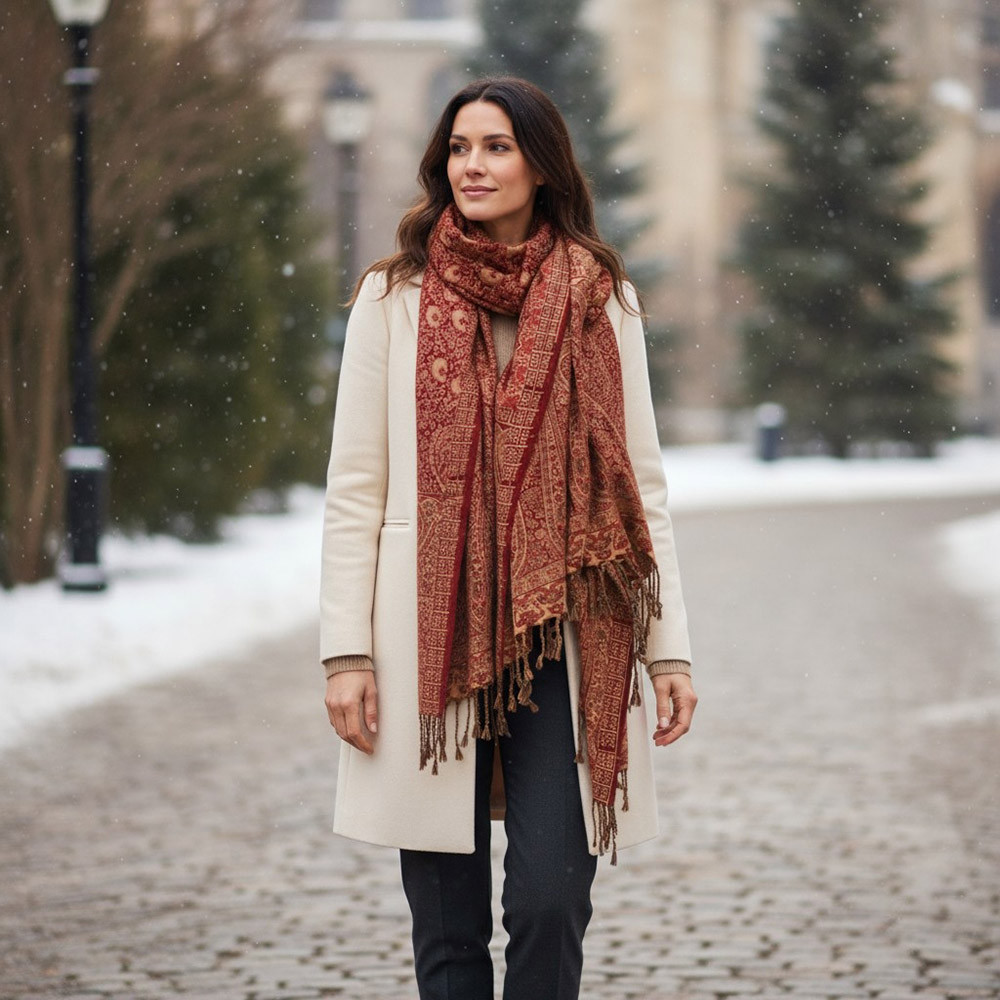 • Großer Schal: Der 215 × 105 cm große Schal ist ein wahrhaft multifunktionales Accessoire, das nicht nur modisch ist, sondern sich auf Reisen auch ideal als Decke oder Strandtuch eignet.